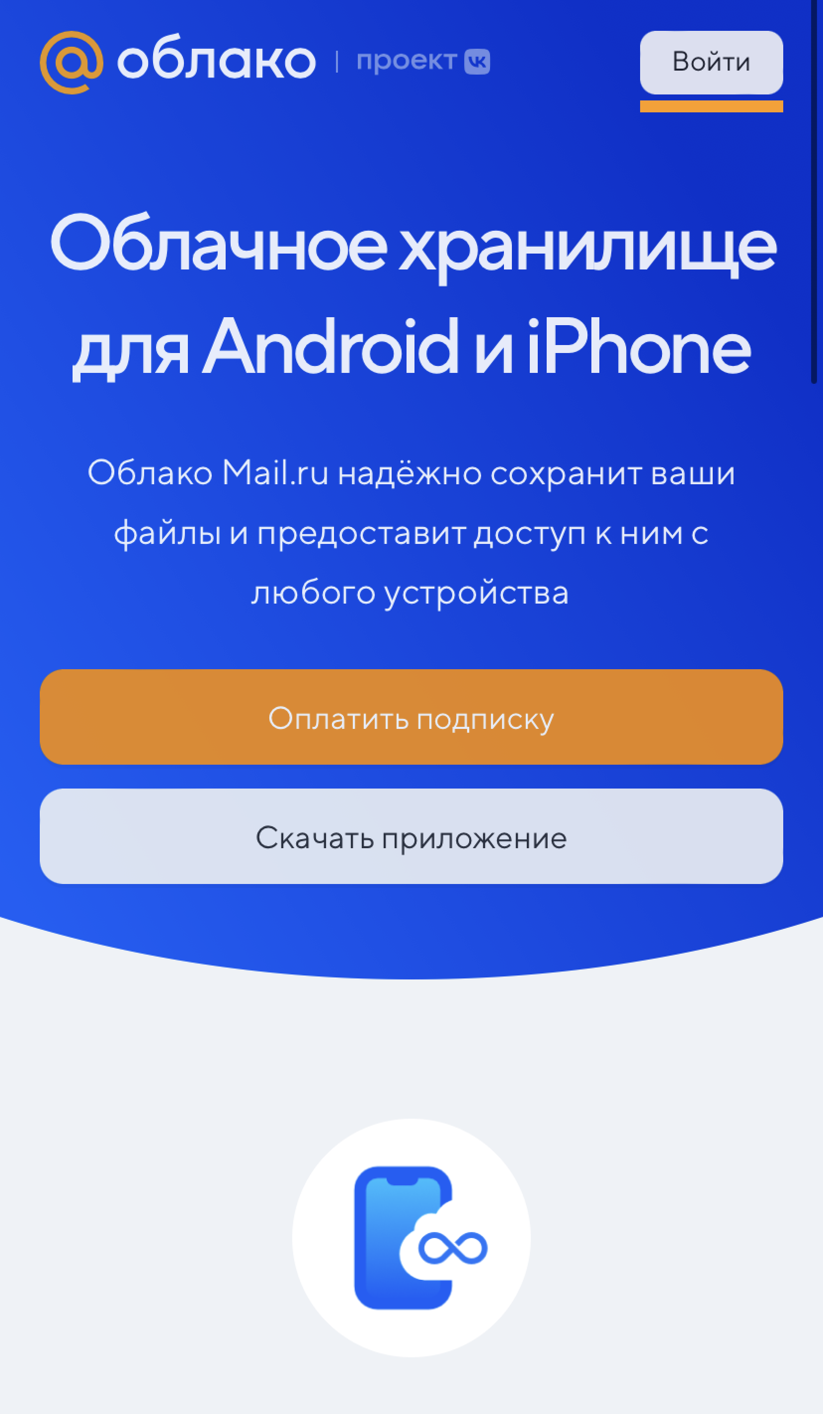 - Перейдите на страницу cloud.mail.ru в мобильном браузере.
