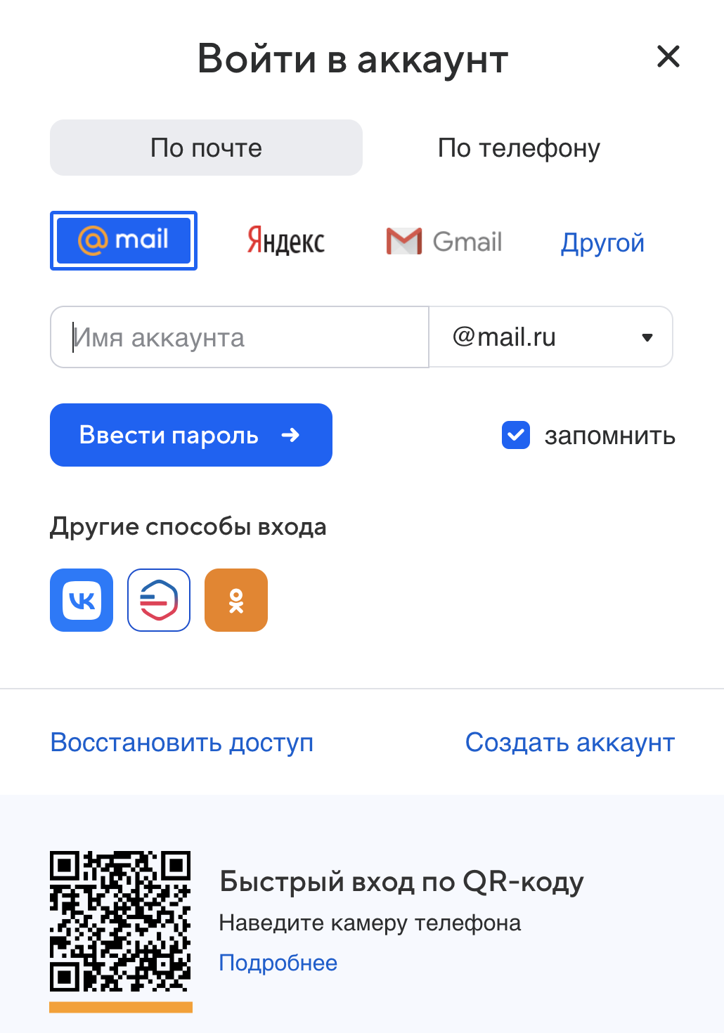 . - Выберите способ входа: по почте, телефону, QR-коду, с помощью VK ID, Госуслуг или Одноклассников.