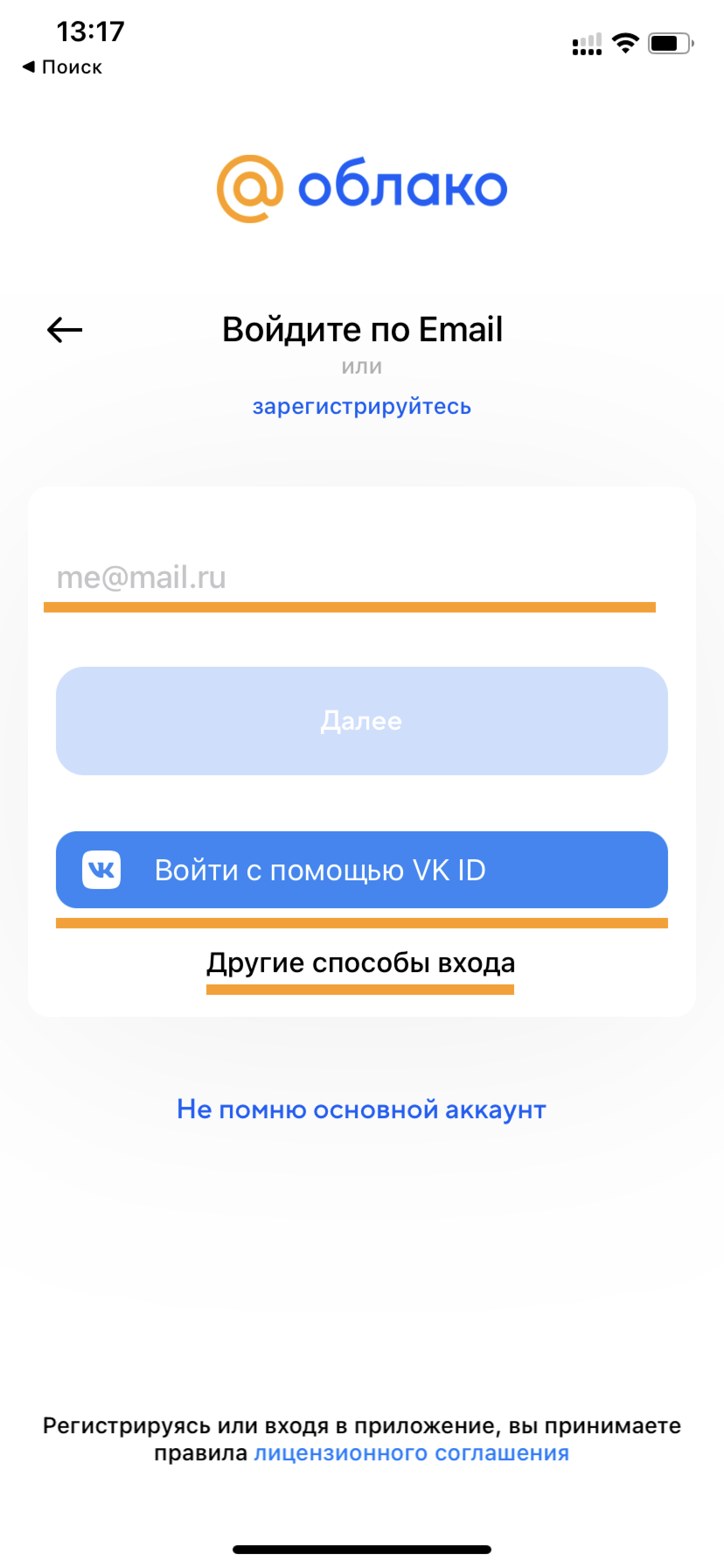 Вы можете войти в Облако по почте — от Mail, Яндекса, Gmail или другого сервиса.
