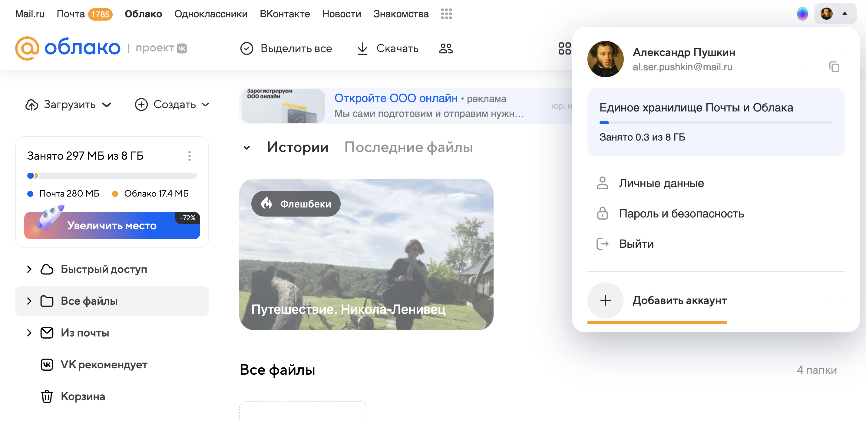 Если у вас несколько аккаунтов в Облаке Mail, добавьте их в Облако и переключайтесь с одного на другой.