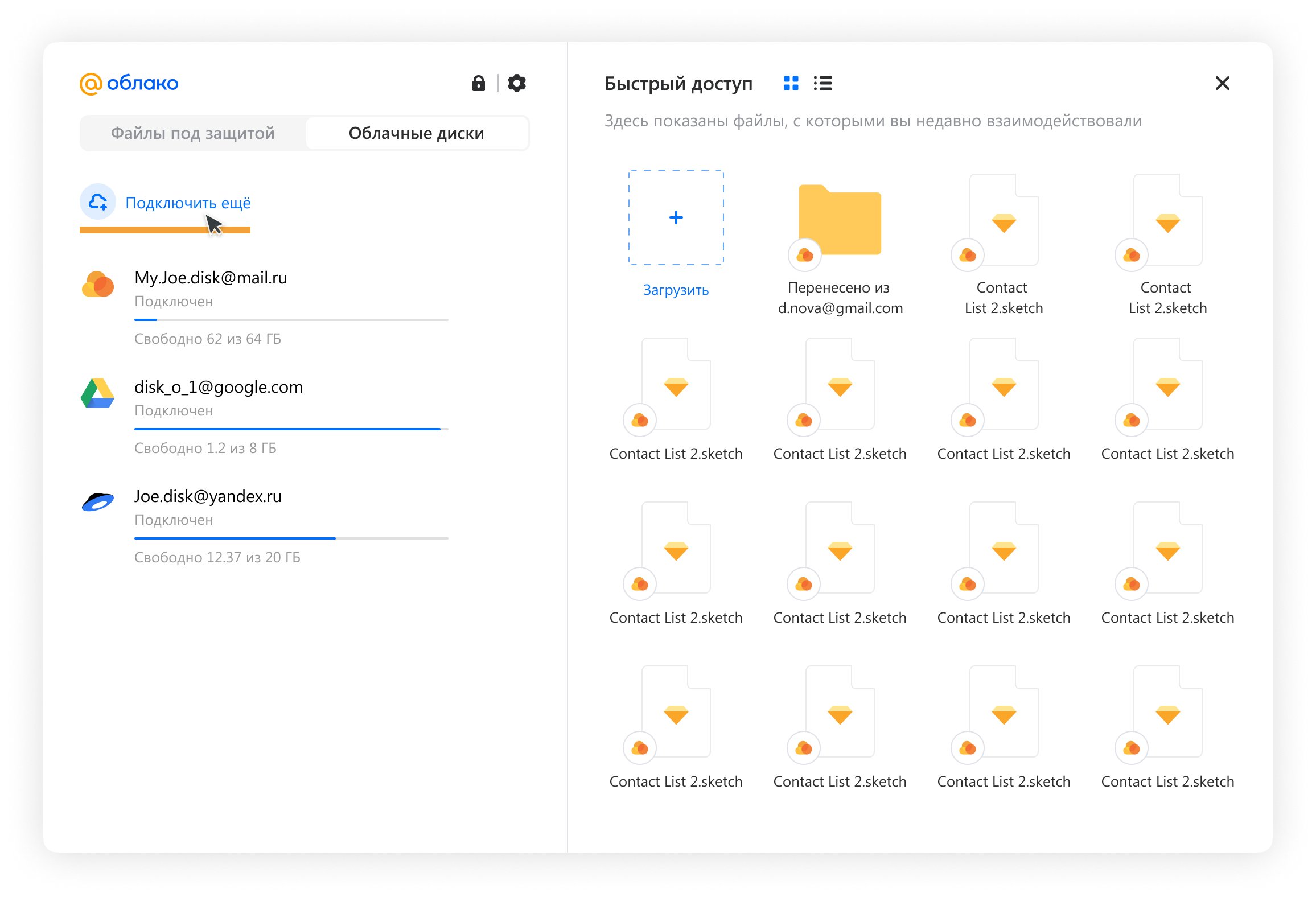 Подключите к приложению Облака свои хранилища от Mail, Google Drive или других сервисов, и работайте с ними в одном месте.