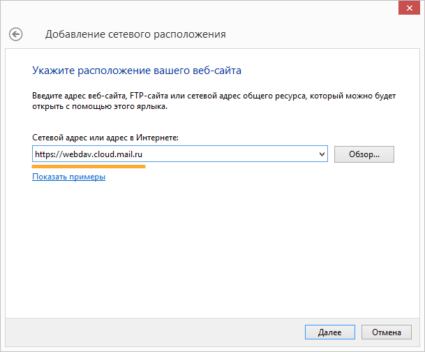 https://webdav.cloud.mail.ruи нажмите Далее.
