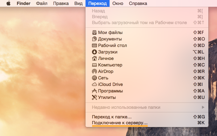 На рабочем столе в панели задач Finder нажмите Переход → Подключение к серверу.
