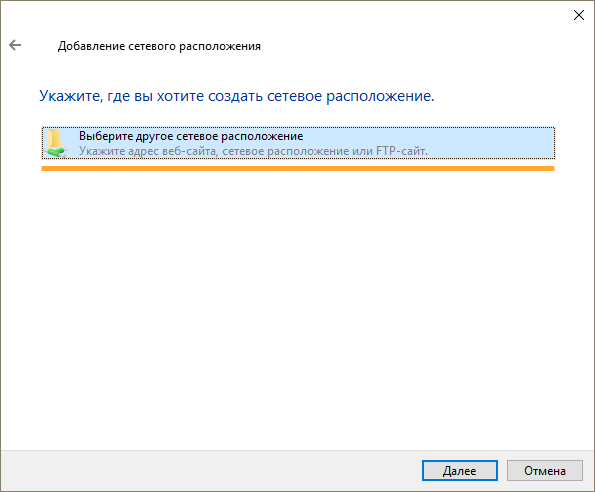 Выделите надпись Выберите другое сетевое расположение и нажмите Далее.