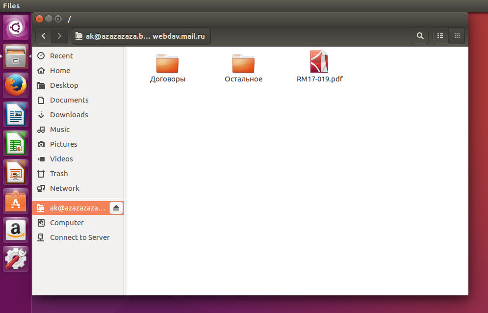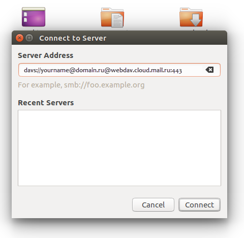 davs://<логин>@webdav.cloud.mail.ru:443, где<логин>— адрес вашего ящика, к которому подключено Облако, в форматеyourname@domain.ru.``
