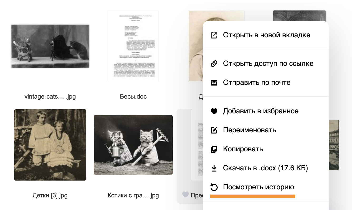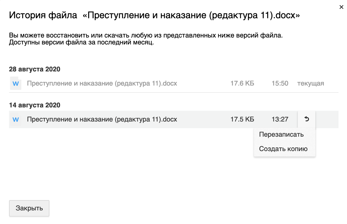 Если у вас подключен один из платных тарифов, вы можете просмотреть историю изменений файла и вернуться к одной из сохраненных версий.