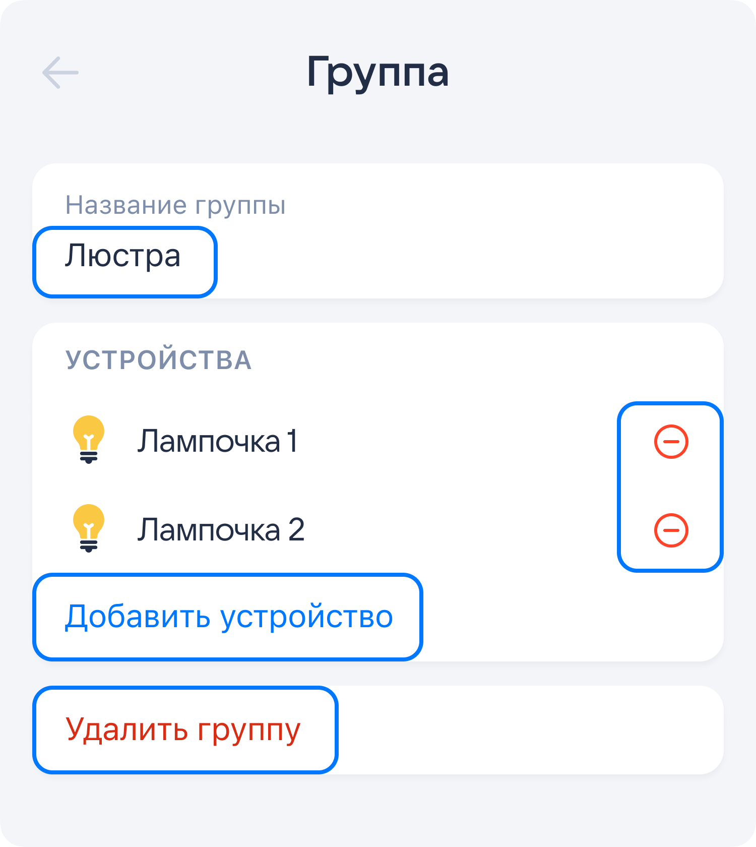 В настройках вы сможете переименовать или удалить группу, добавить или убрать устройства.