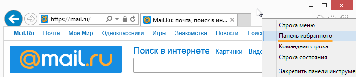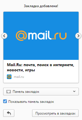 - Установите переключатель Отобразить панель избранного в положение Вкл.. Быстрая ссылка на mail.ru появится в панели под адресной строкой.