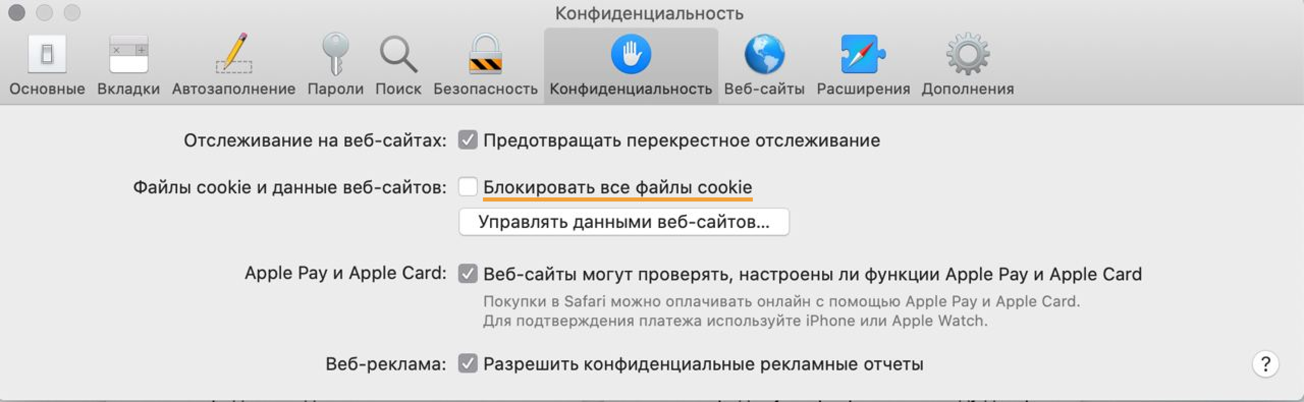 Уберите галочку слева от Блокировать все файлы cookie.
