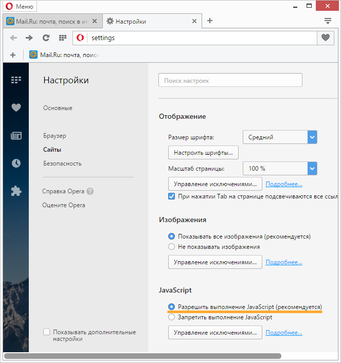 → Настройки → **Сайты.В разделе Java Script установите переключатель в положение Разрешить выполнение JavaScript.