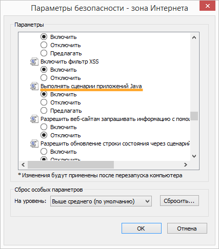 В пункте Выполнять сценарии приложений Java установите переключатель в положение Включить.
