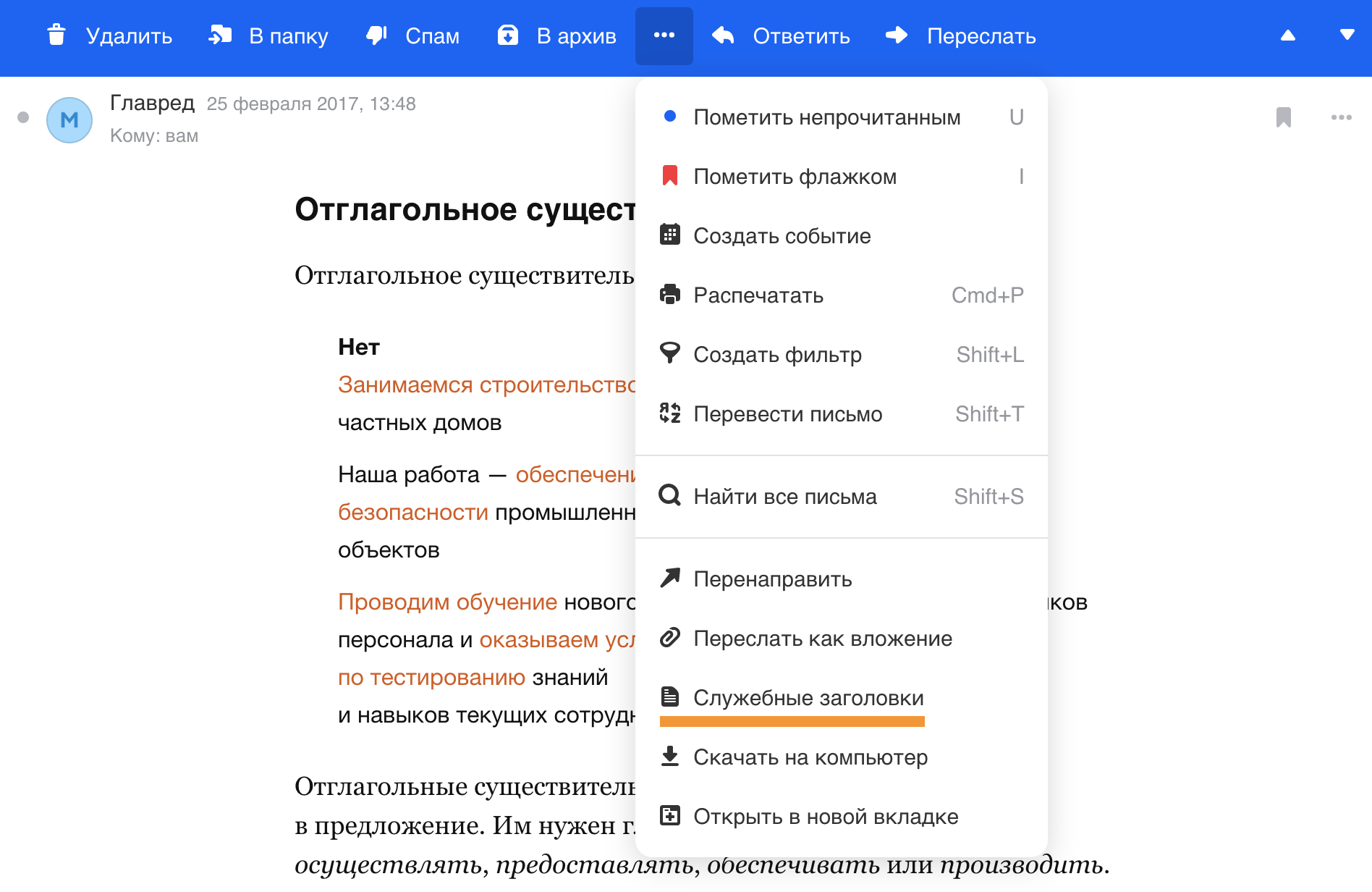 Чтобы посмотреть служебные заголовки отдельного письма: