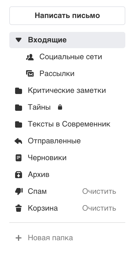 Список папок автоматически сворачивается на экранах с небольшим разрешением — так они не занимает место списка писем. Открыть список папок можно, нажав на значок