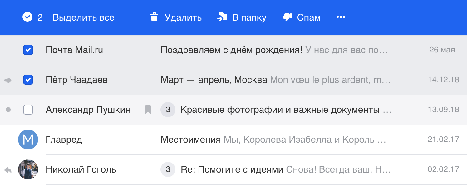 Чтобы выделить письмо, наведите курсор на аватарку и установите галочку. После выделения в панели над письмами появляется список действий.