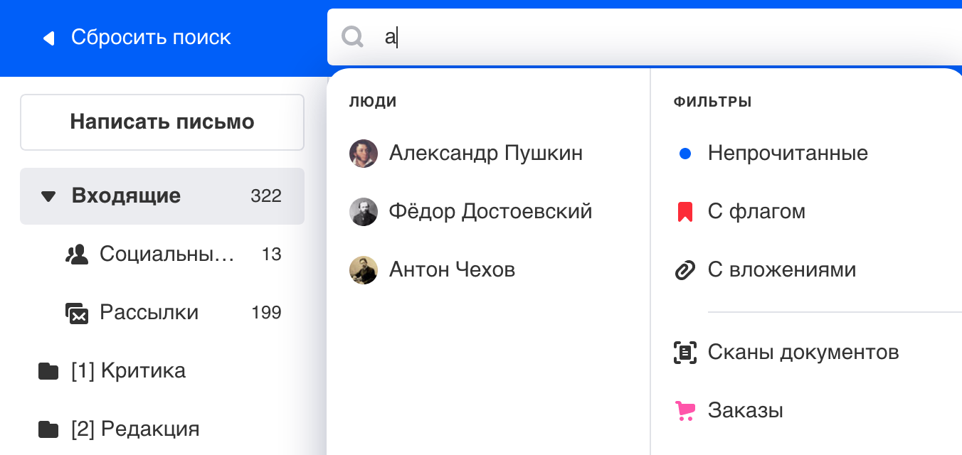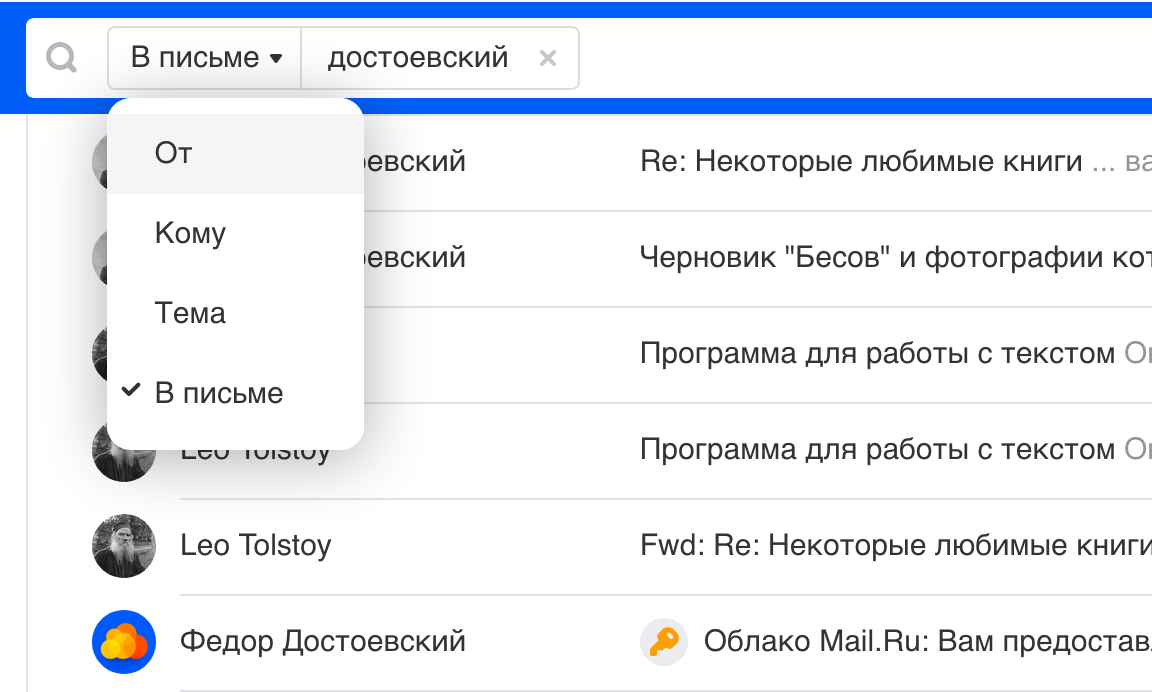 Если Почта не предложила людей для поиска, введите адрес или имя до конца и нажмите Enter. Почта найдет письма, в которых есть это слово. Чтобы показать совпадения по адресам, нажмите В письме и выберите параметр От.