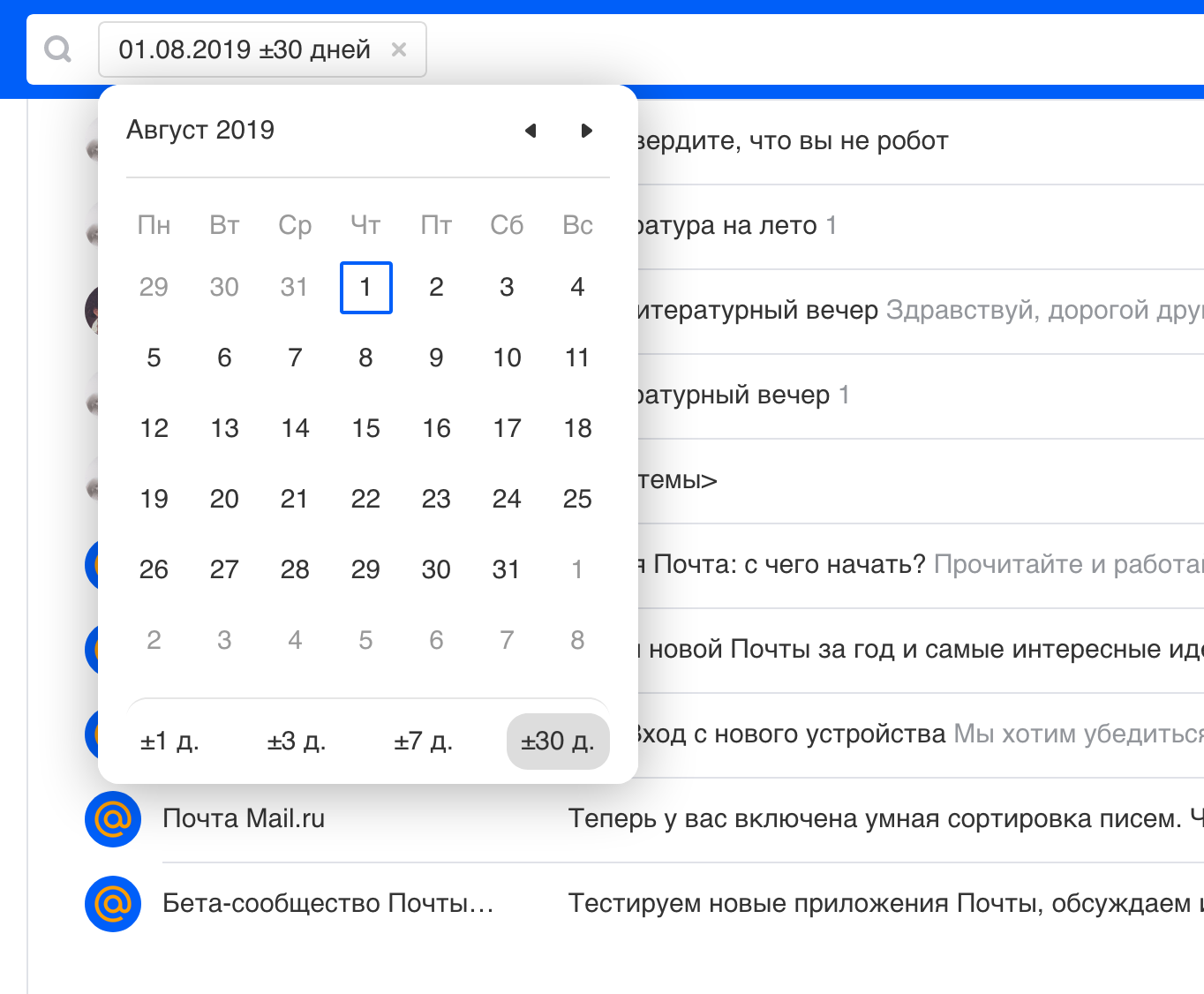 Например, если вы попросите найти Почту письма за 1 июня 2019 года ±30 дней, она покажет письма со 2 мая по 1 июля 2019 года.