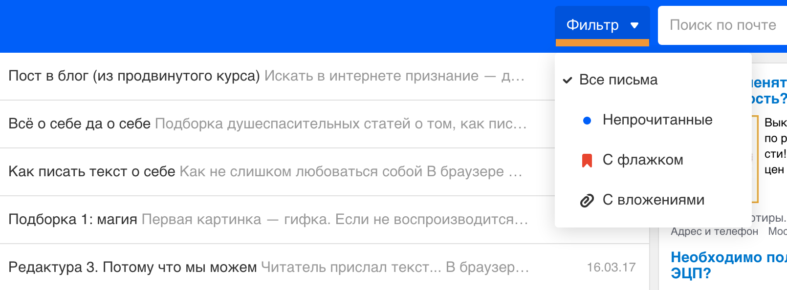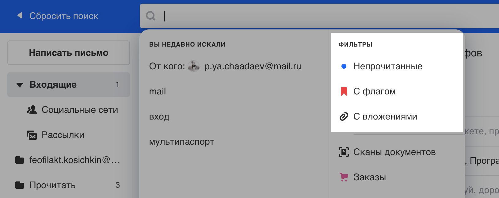 Установите курсор в строку поиска и выберите фильтр Непрочитанные. Почта покажет все письма в почте с этим признаком.