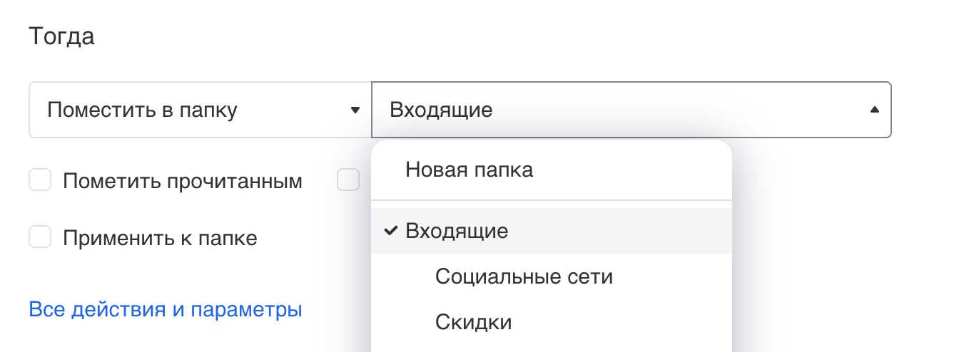 Выберите папку, в которую фильтр будет перемещать письма. Если нужно, создайте новую папку.