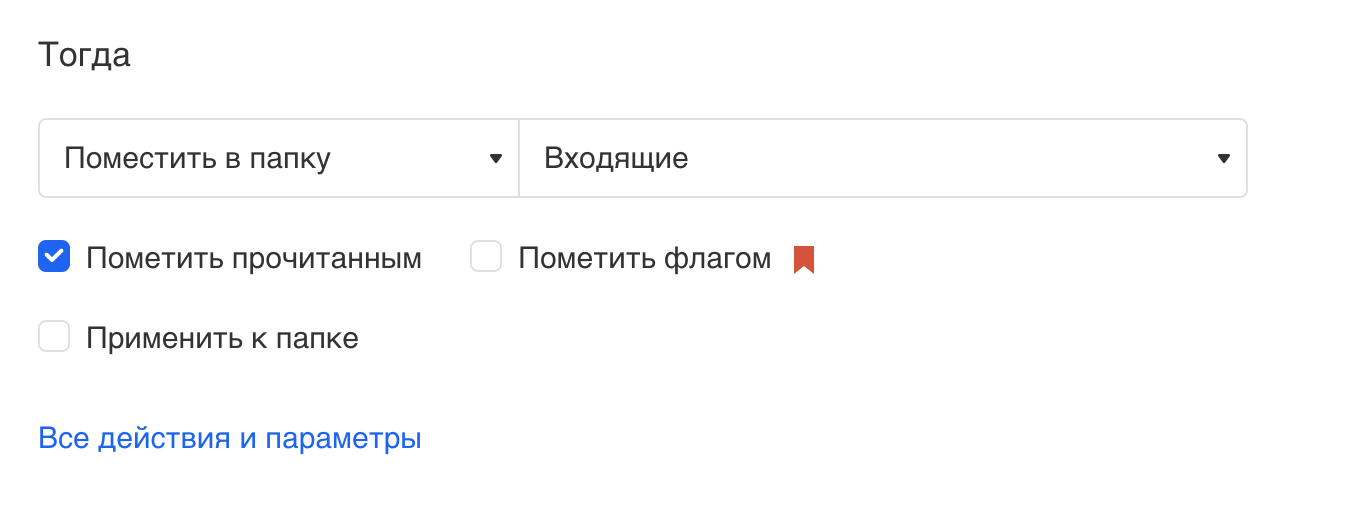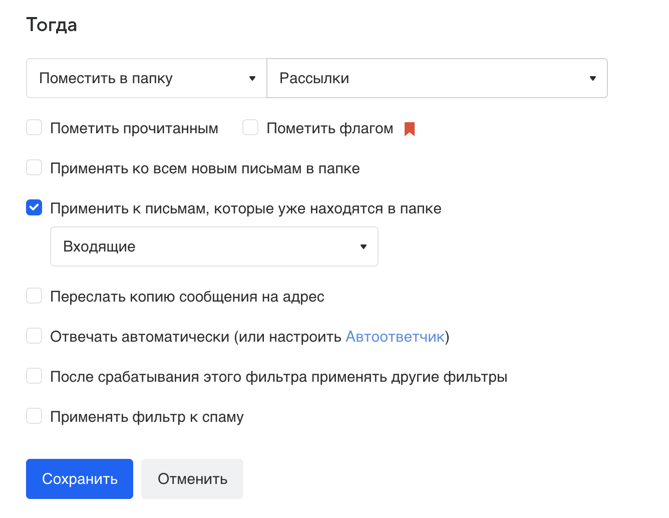 Фильтр сработает единовременно. Чтобы ещё раз отфильтровать письма в существующей папке, снова отметьте их в списке и нажмите Сохранить.