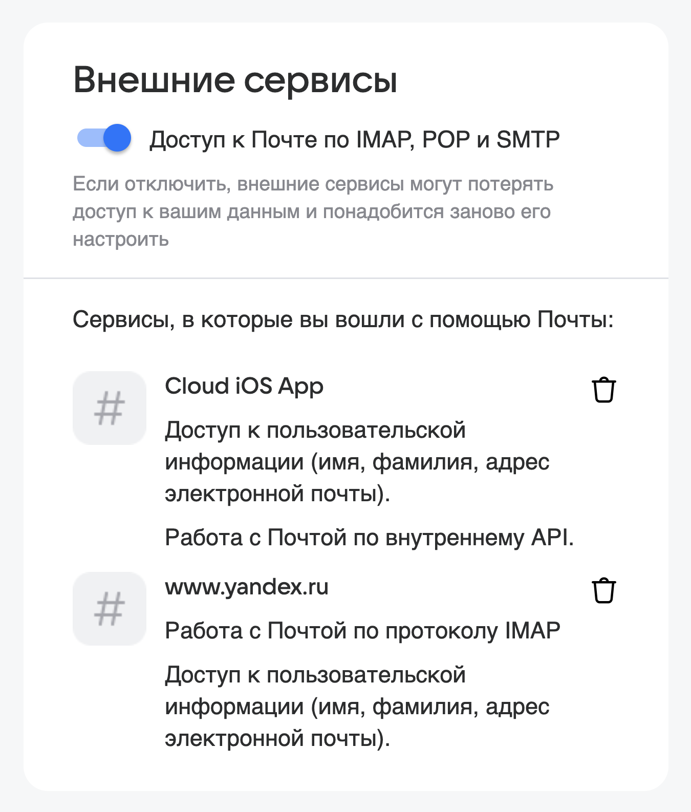 Когда вы входите во внешний сервис с помощью Mail, сервис может запросить доступ к письмам в вашем ящике. Если разрешить такой доступ, сервис сможет читать, удалять и отправлять письма от вашего имени.